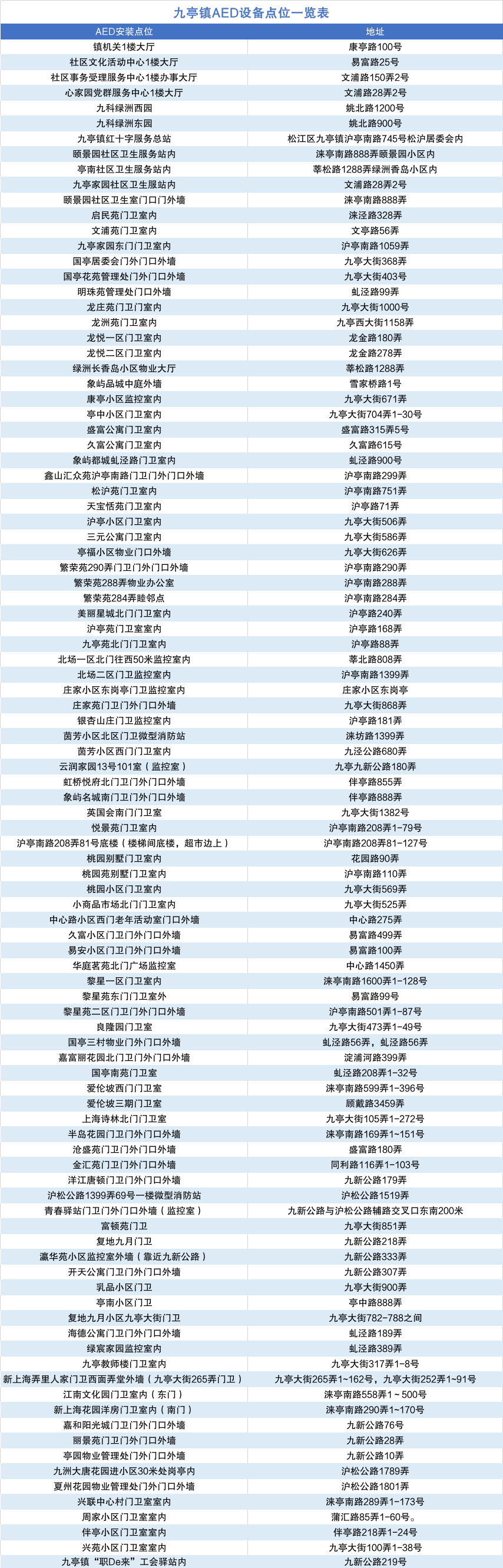 借助本年度松江区民生实事项目“在居民住宅小区增配不低于700台自动式体外除颤器(AED)”的契机,九亭镇日前已完成全镇89个小区AED安装工作,九亭镇AED数量由原先的11台增加至100台,急救网络不断织密织大,为辖区居民构筑起了一道坚实的安全防线。